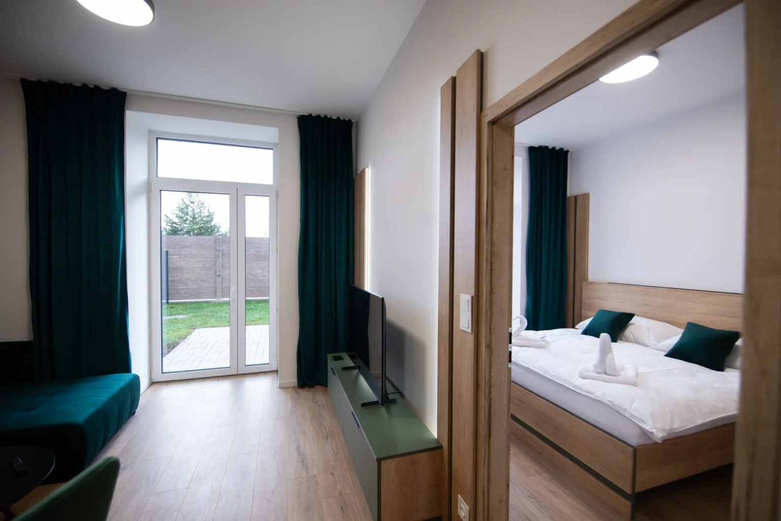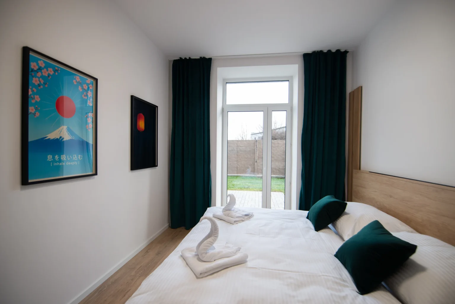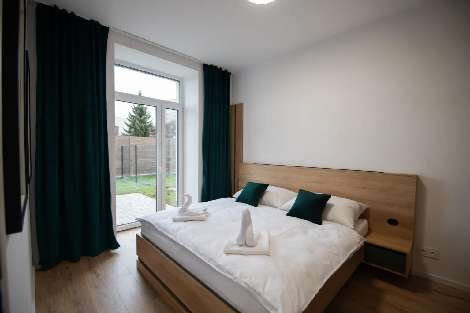 Oáza pokoja s moderným dizajnom a priamym vstupom do súkromnej predzáhradky. Dominantou je pohodlná manželská posteľ s vysokým kvalitným matracom a hotelovou bielizňou.