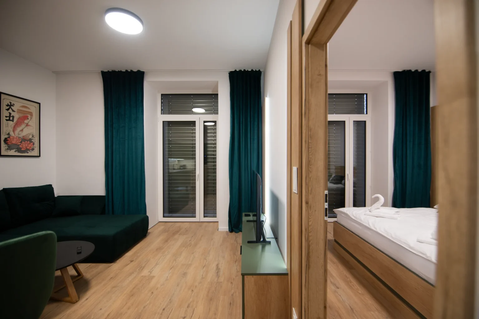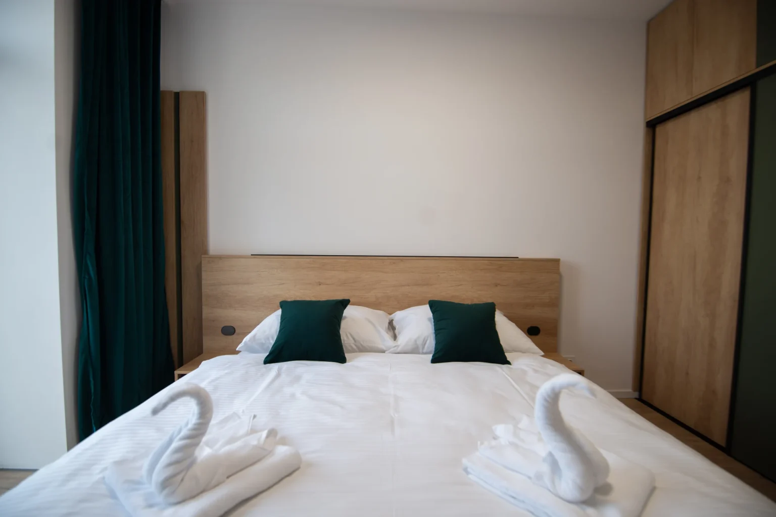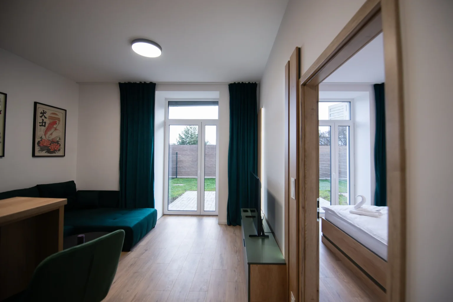 Oáza pokoja s moderným dizajnom a priamym vstupom do súkromnej predzáhradky. Dominantou je pohodlná manželská posteľ s vysokým kvalitným matracom a hotelovou bielizňou.