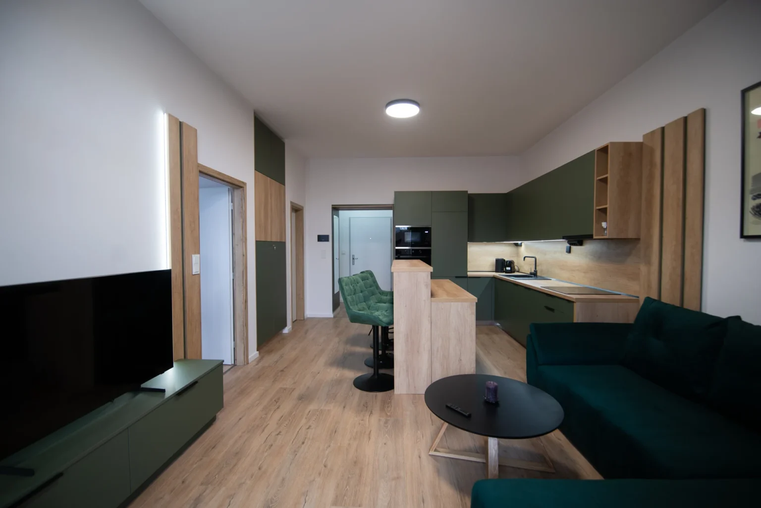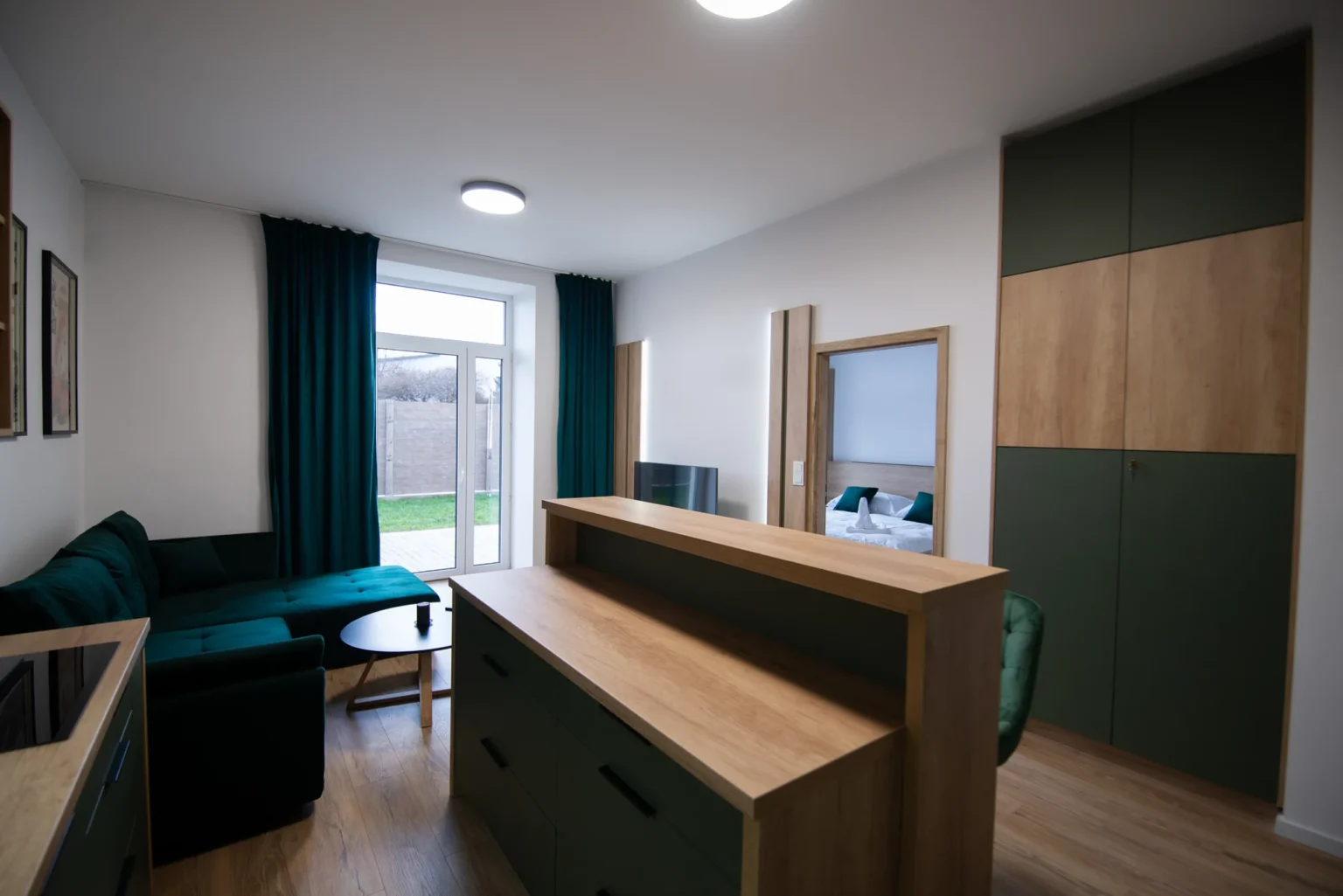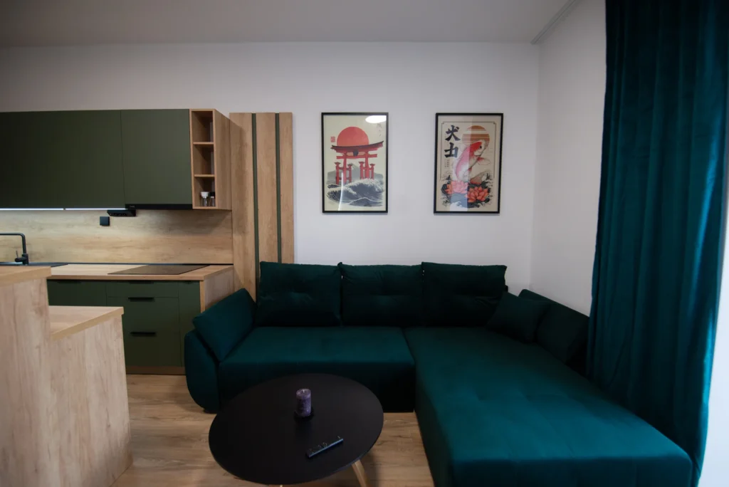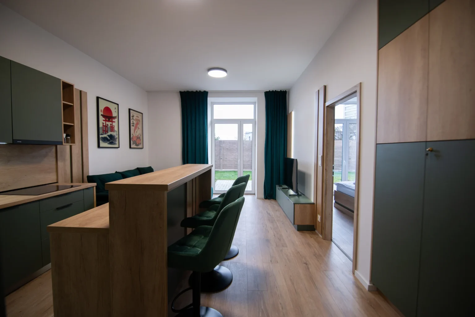 Obývacia izba disponuje rozkladacím gaučom a Smart TV, zatiaľ čo plne vybavená kuchyňa ponúka moderné spotrebiče, rozsiahlu kuchynskú linku a barové stoličky. Celý priestor je presvetlený s priamym vstupom na predzáhradku.
