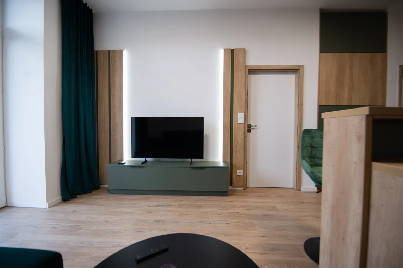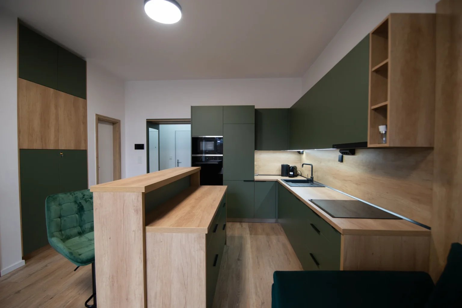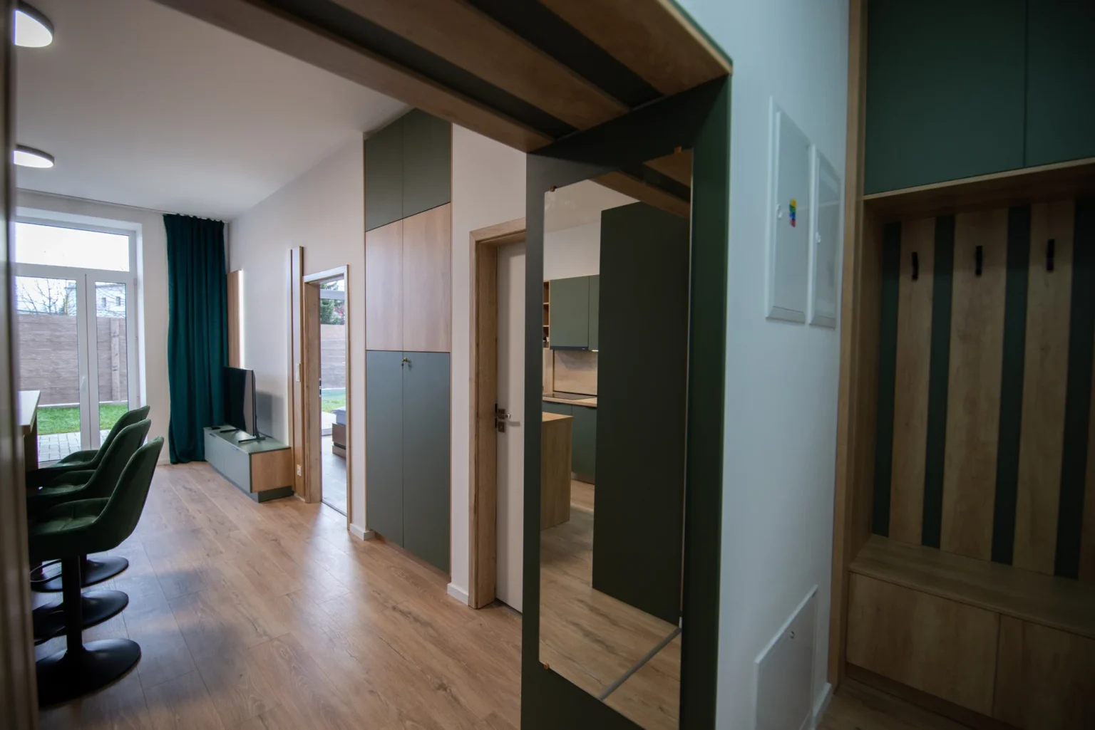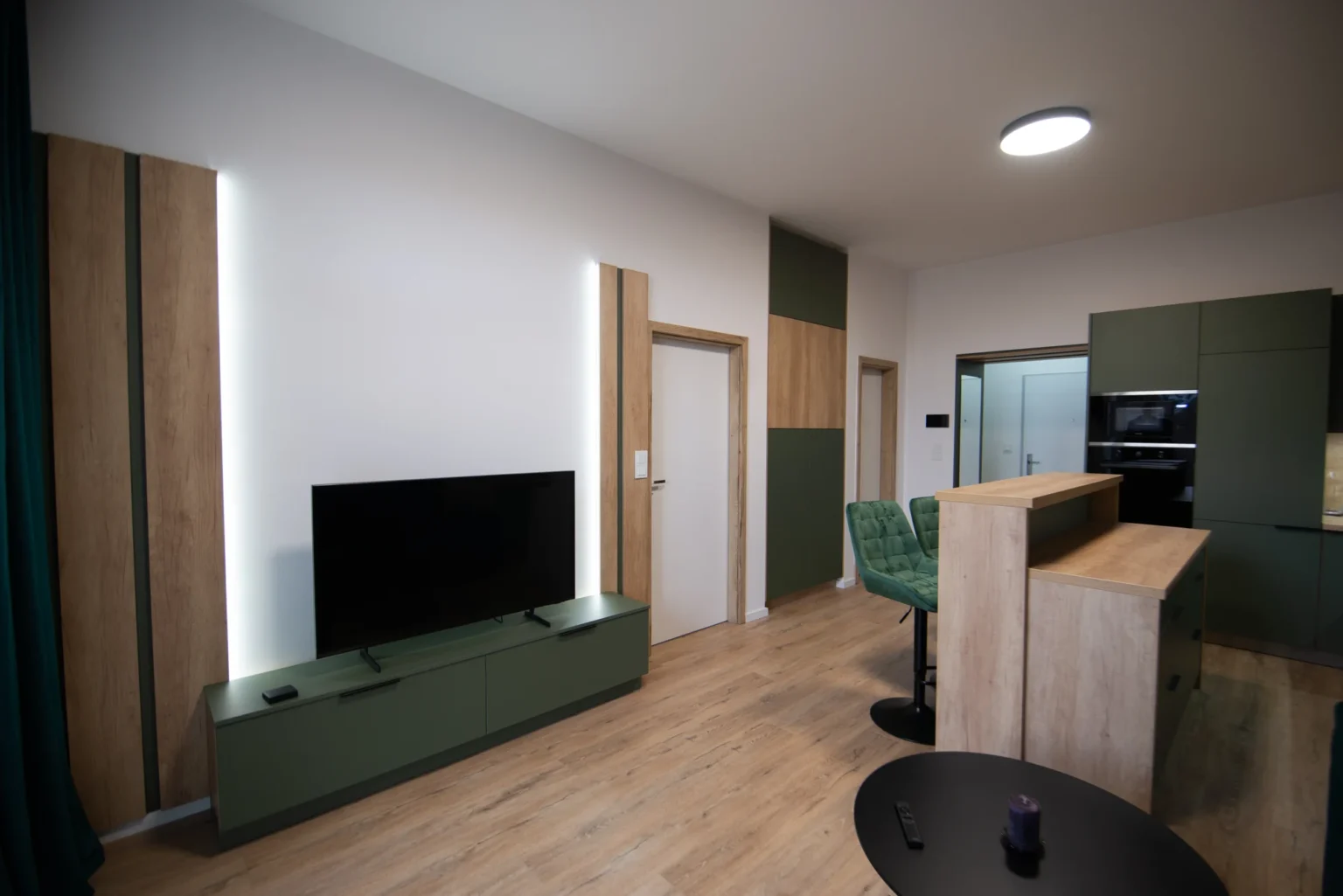 Obývacia izba disponuje rozkladacím gaučom a Smart TV, zatiaľ čo plne vybavená kuchyňa ponúka moderné spotrebiče, rozsiahlu kuchynskú linku a barové stoličky. Celý priestor je presvetlený s priamym vstupom na predzáhradku.