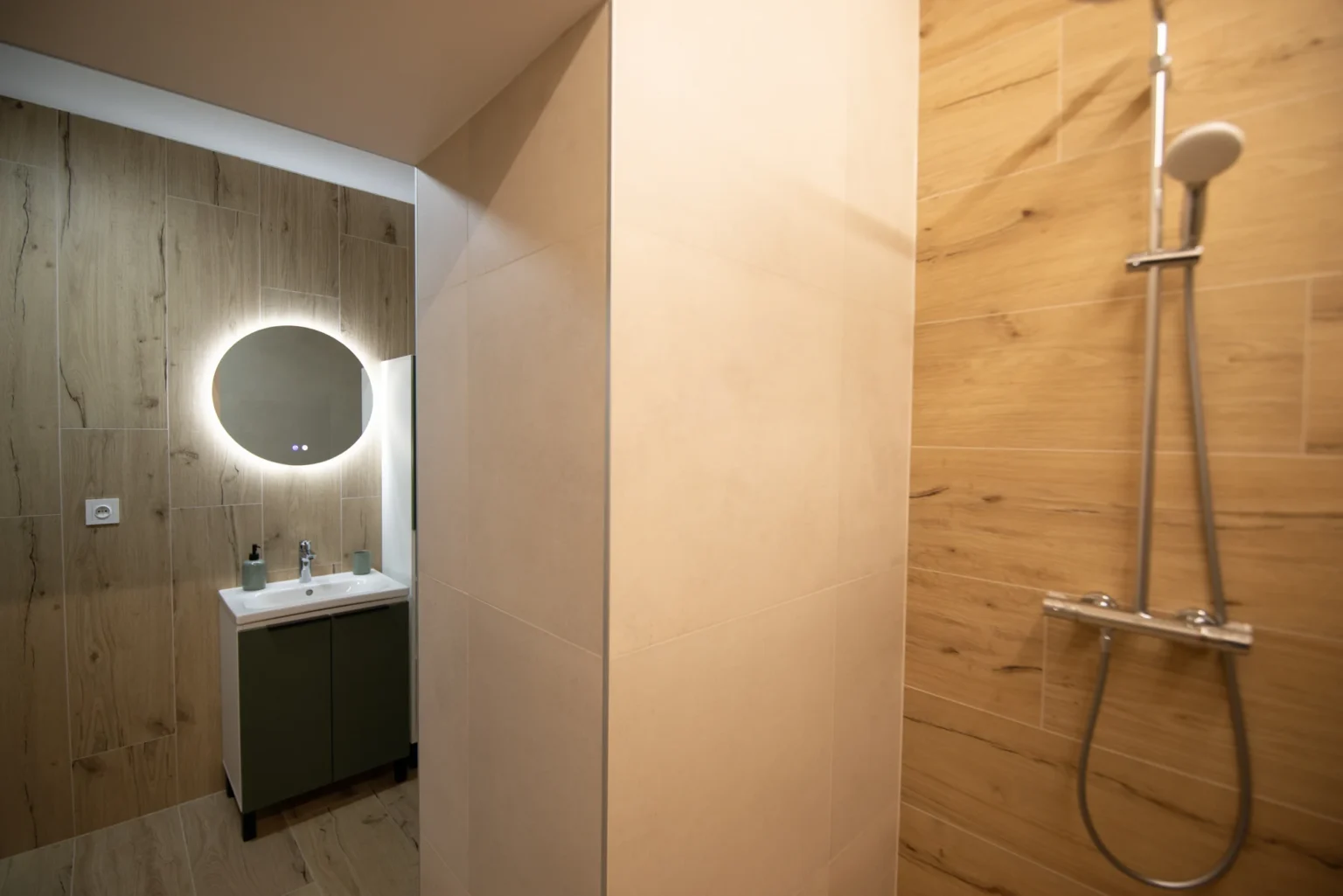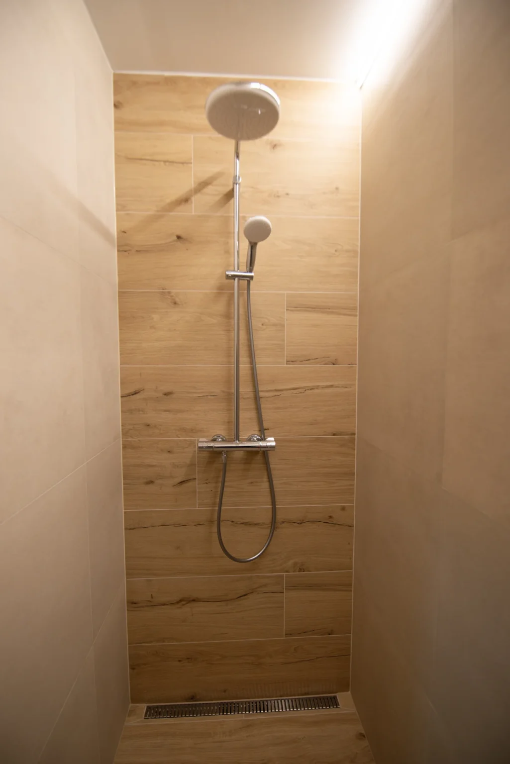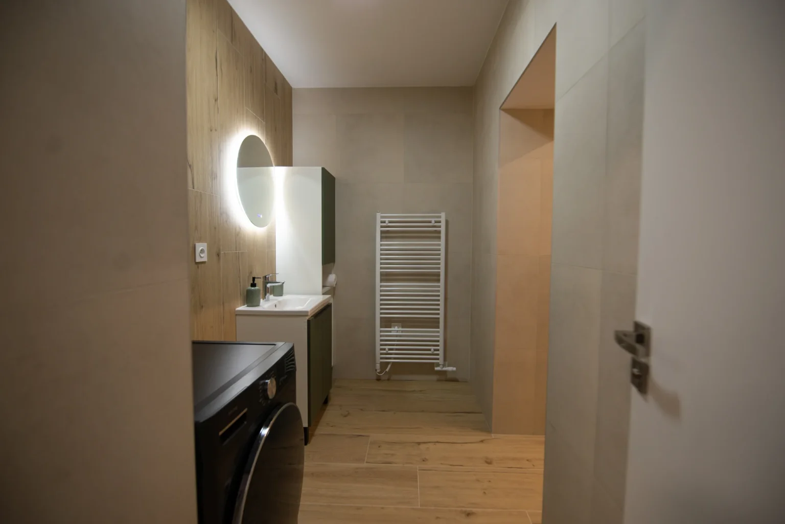 Elegantná kúpeľňa s priestranným sprchovým kútom, fénom, základnými hygienickými potrebami a práčkou so sušičkou.
